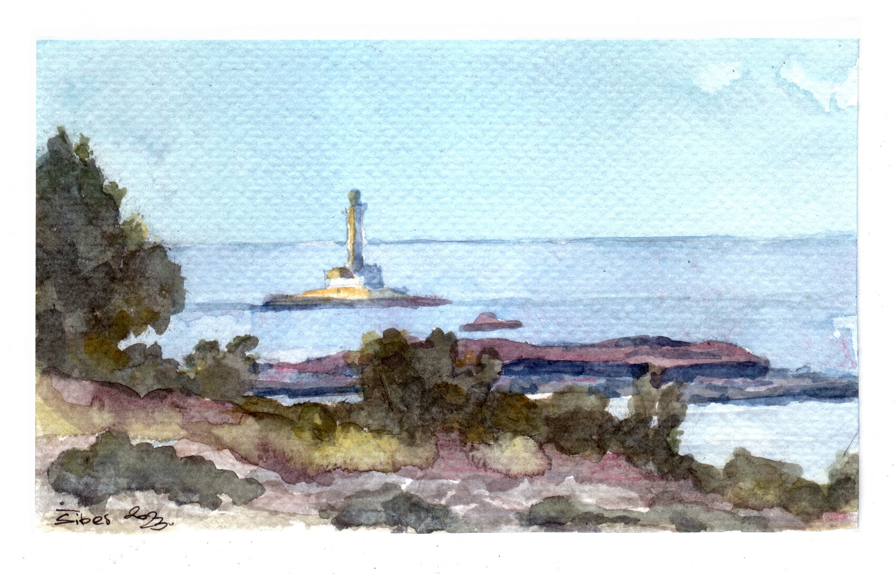 A kad se uvjerih da su mi mačke ipak u glavi, a ne u ruksaku, prionuh i na još koju skicu za dječicu pa sam slikao otočić sa svjetionikom u daljini, viđen preko škrtog bilja u prosincu (tko zna gdje je to?)...