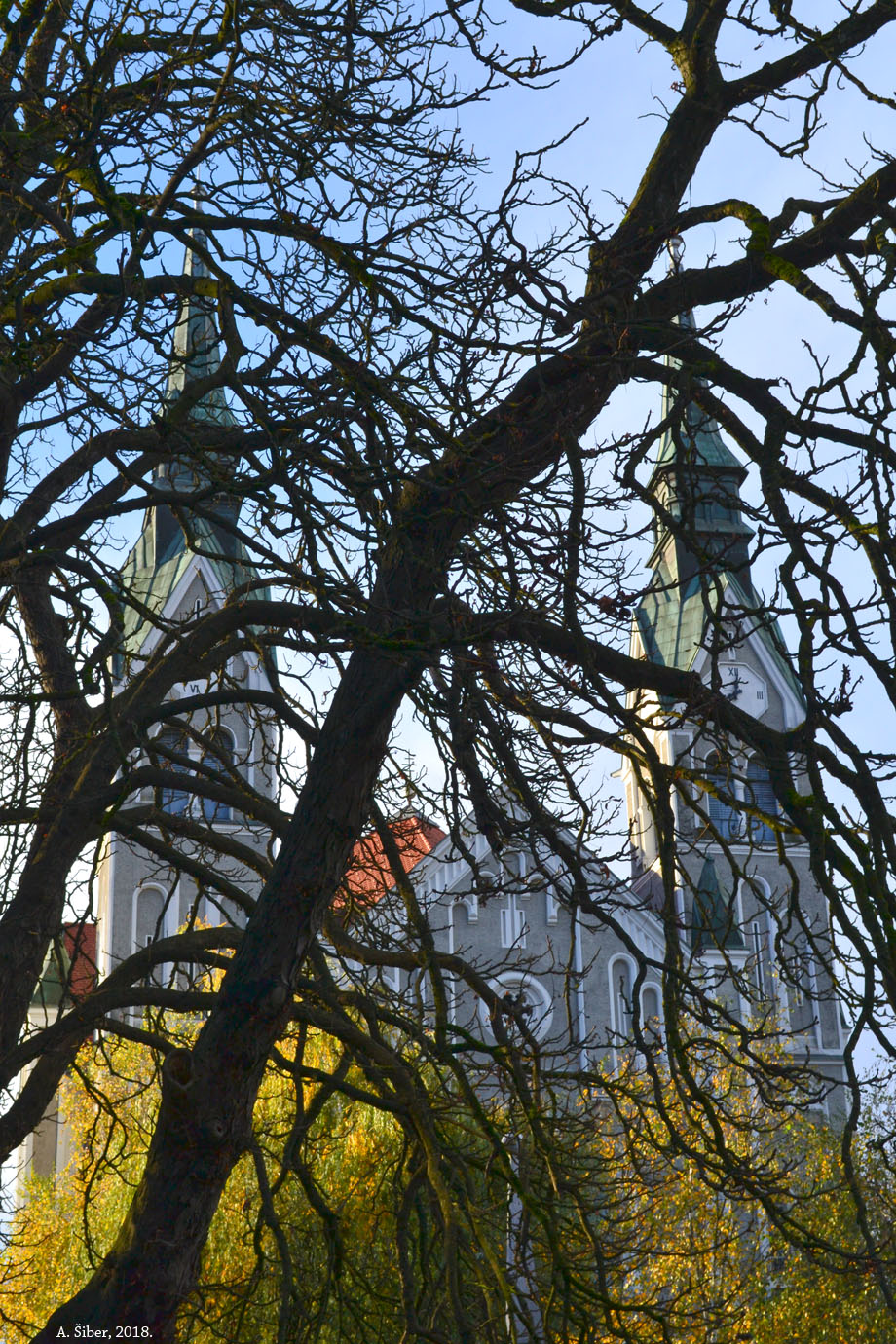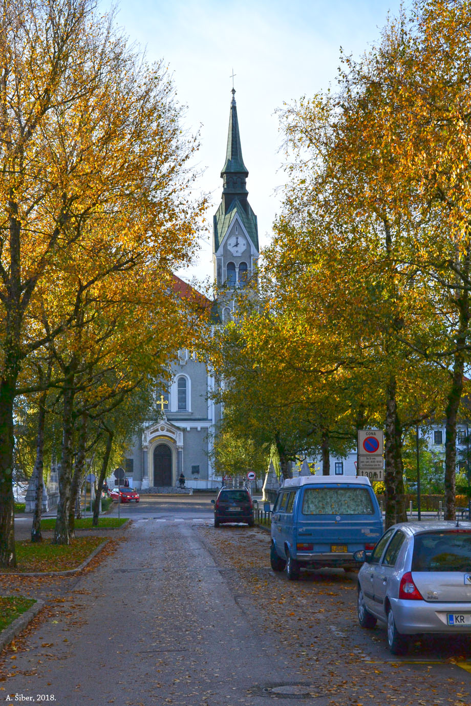 Bilo je mnogo dana u ljubljanskoj jeseni 2018. godine koji nisu bili topli, nego vlažni i hladni. I tada je znalo biti lijepo. Paleta je suzdržanija, povučenija. Boje su manje saturirane, a krošnje ispred crkve u Trnovu ne svijetle posve toplo nego su prigušene (ispod). Asfalt je vlažan, padala je kiša, i u njemu se ogledaju svjetla automobilskih farova. I to je jesenski akvarel, samo hladniji.