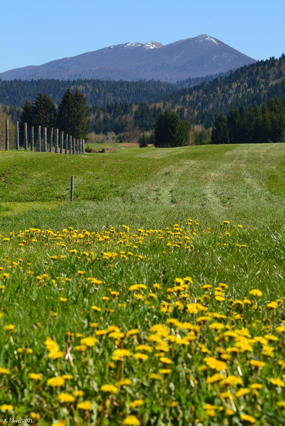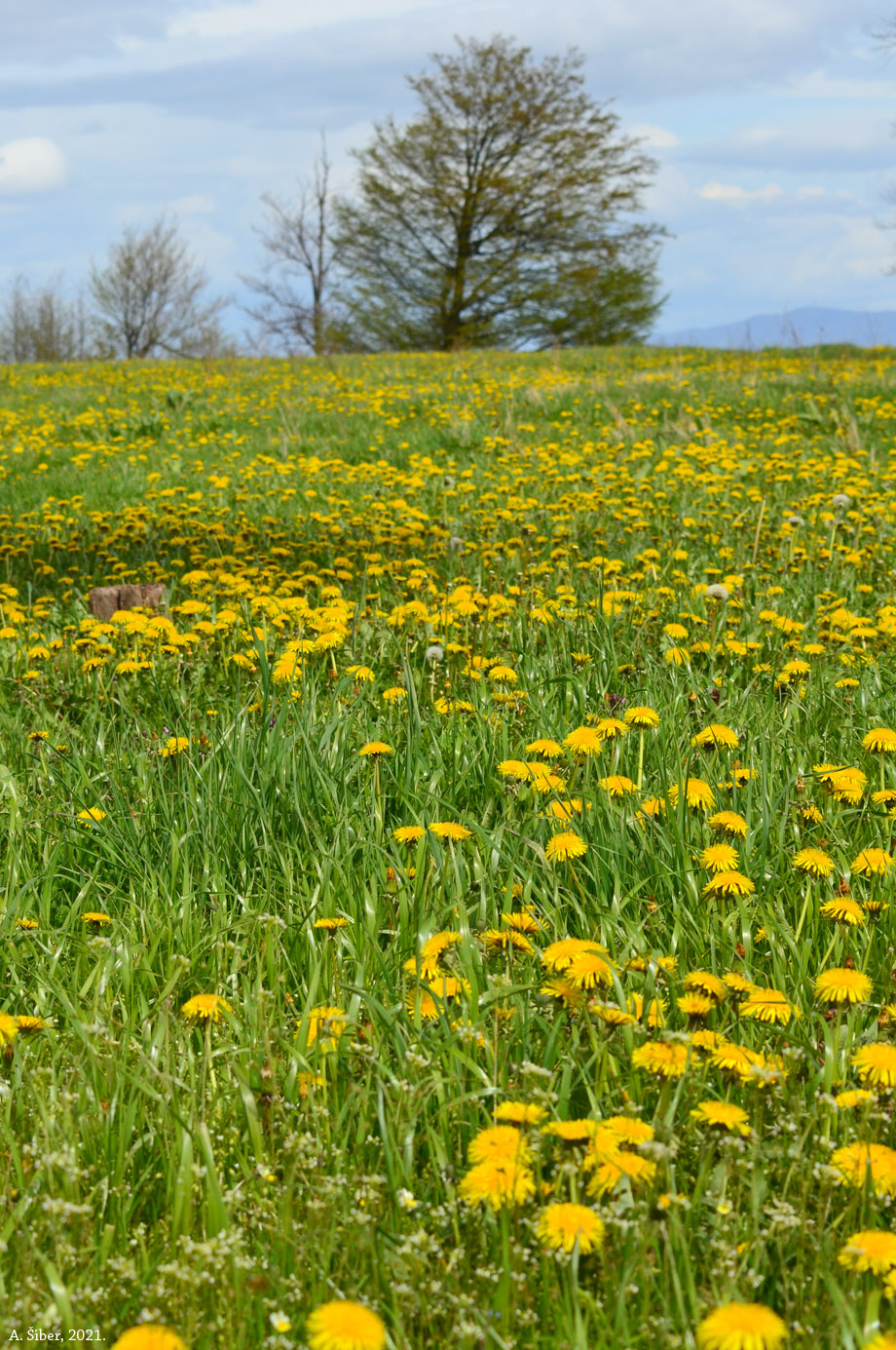 Drugog svibnja otišli smo opet na Žumberak, ovaj put prema Budinjaku. Iako nije bilo čistog neba i sunca, livade su bile pune maslačaka (ispod).