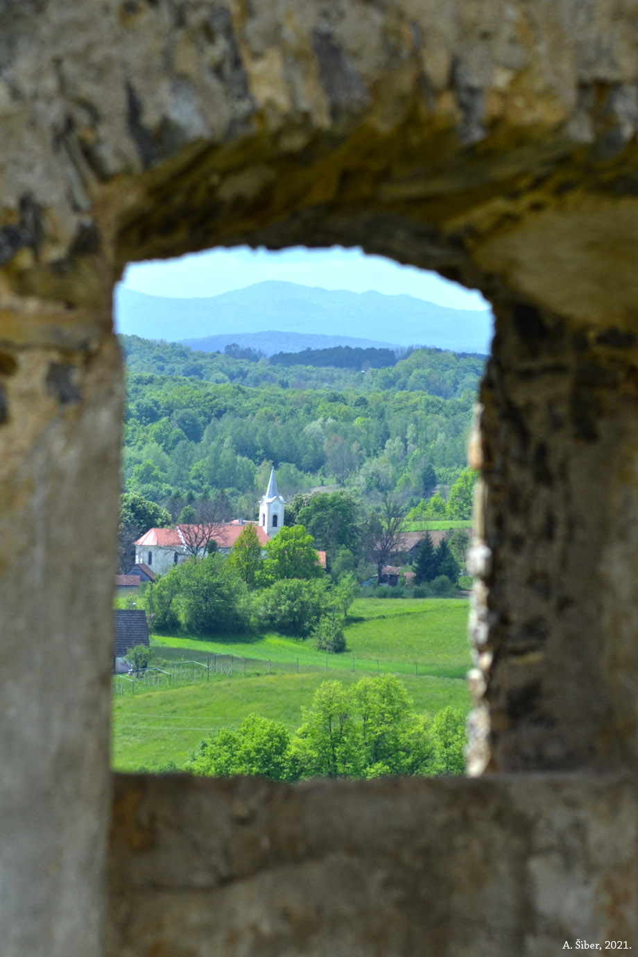 Kroz prozore kaštela puca lijep pogled na Dobru i mekane bregove iznad nje (ispod).