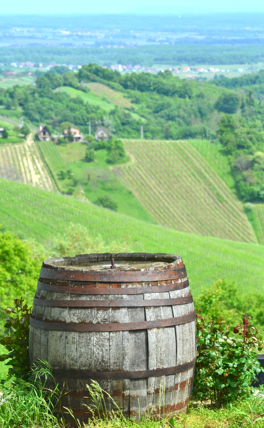 Kod plešivičke vinarije puca lijep pogled preko starog bureta (ispod).