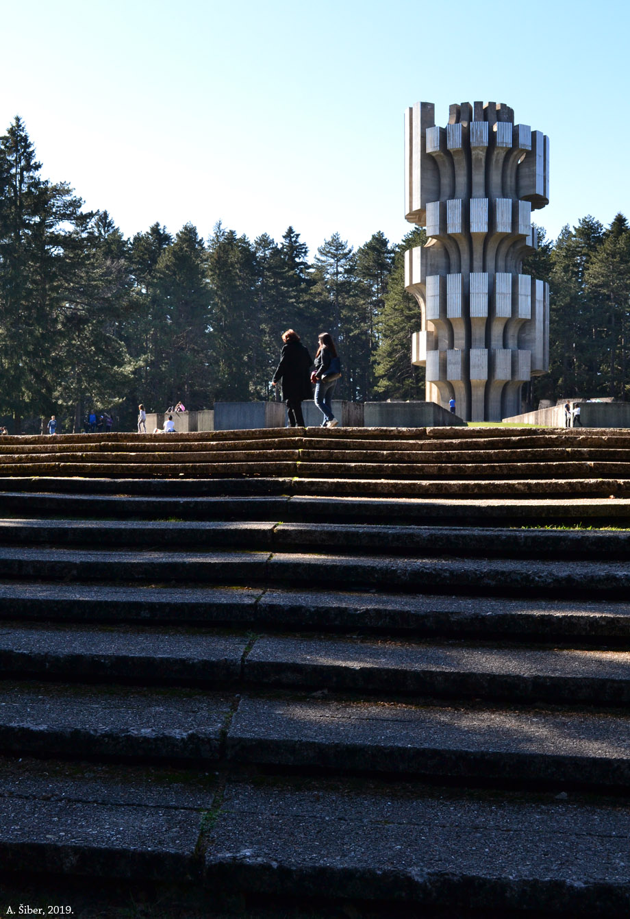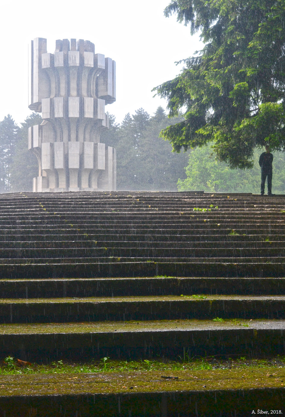 Ljudi koji su danas ovdje pobjegli su od vreline nizine, asfalta i betona. Leže u hladu, režu se lubenice i pali vatra za roštilj. Ja mislim da malo tko razmišlja o spomeniku, Džamonji ili o povijesti, slobodi, socijalizmu i NOB-u (ispod).