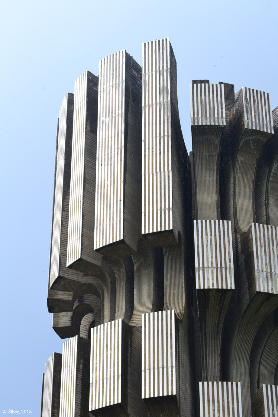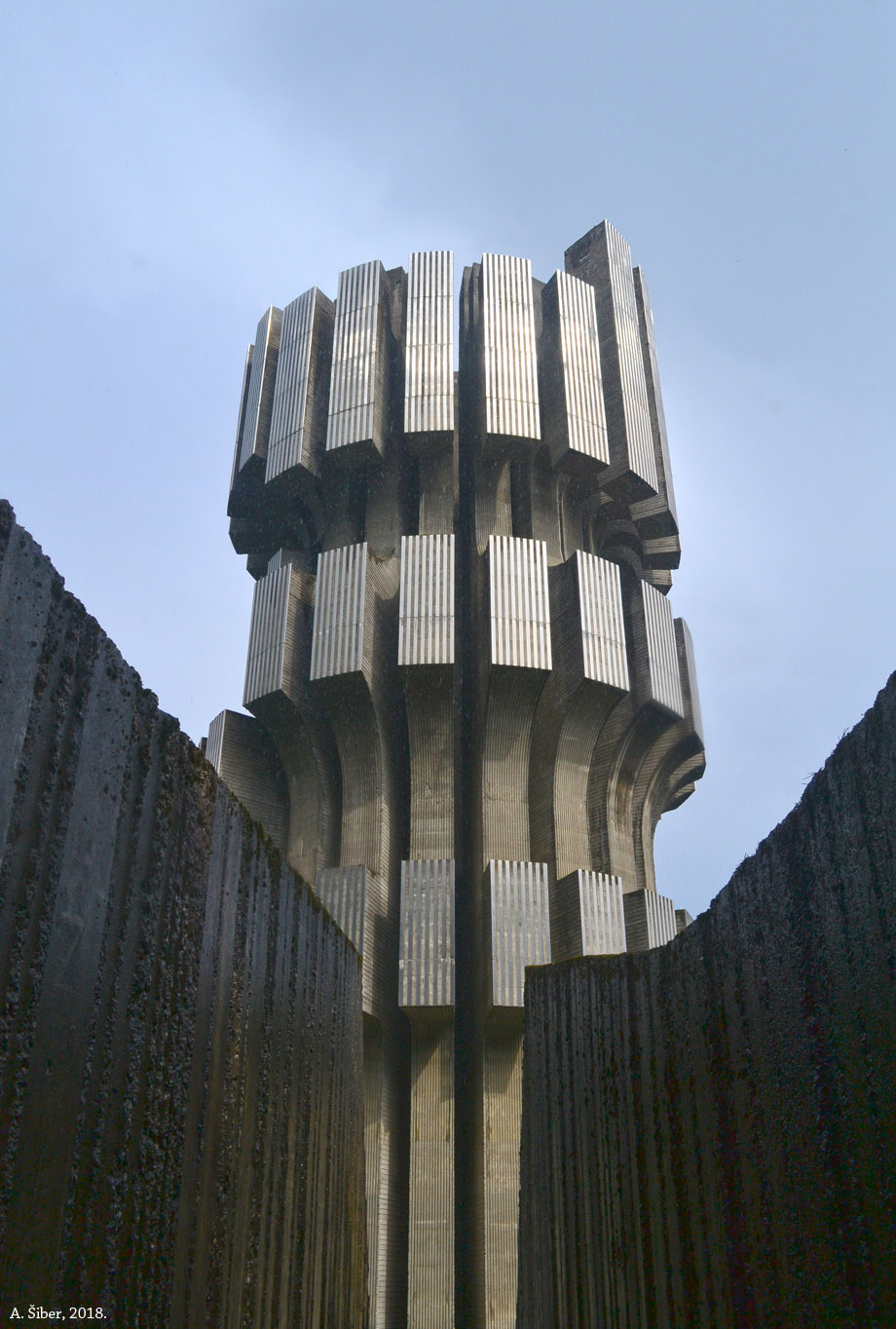 Dušan Džamonja. Beton i nerđajući čelik. Visok 30 m (iznad i ispod). No, >> spomenik u Podgariću je znatno jači.