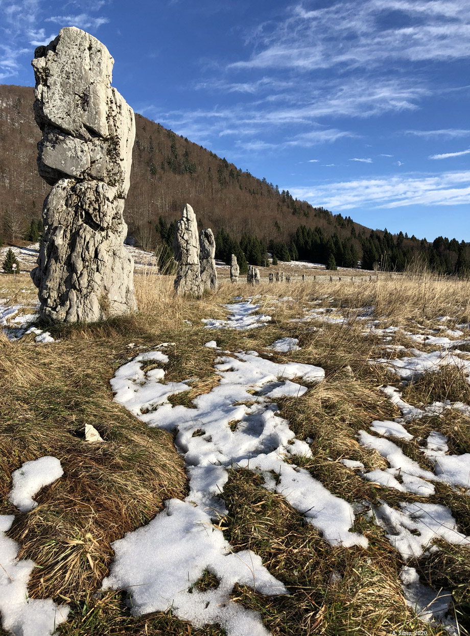 Snijega nigdje nije bilo sve do oko 1050 m nadmorske visine, ali iznad toga počele su se polako pojavljivati krpice i trakice snijega, a pogotovo je snjegovito bilo u Begovom Razdolju. Malo snijega se vidi i na ovim fotografijama iz Matić poljane (iznad i ispod; >> kliknite na fotografiju ispod da je prikažete u dvostrukoj rezoluciji).