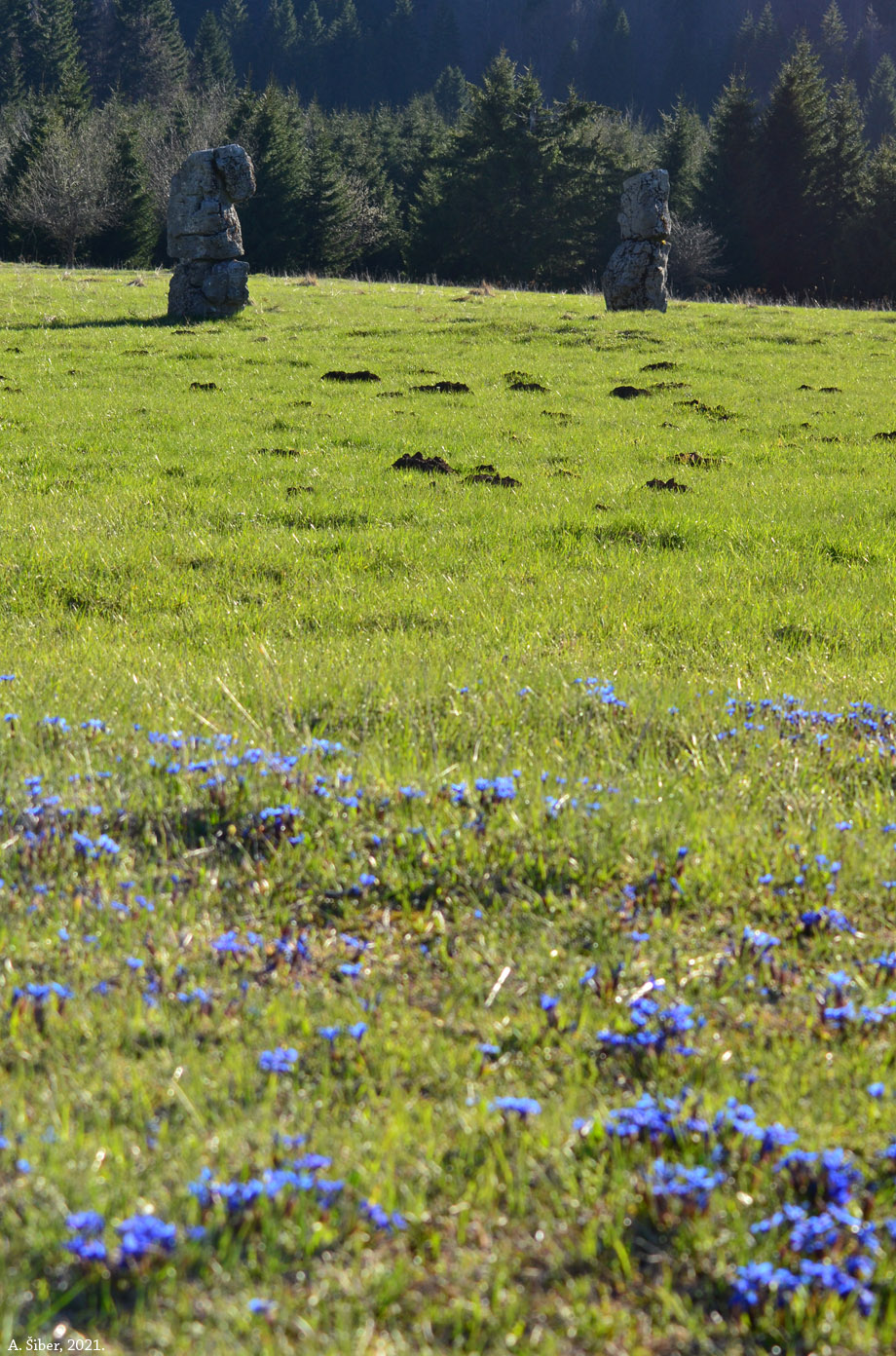 NADOPUNA: (10. 5. 2021.) Ovi lijepi plavi cvjetovi koje smo jučer vidjeli na Matić poljani (ispod; fotografirano u 19:40) su skoro sigurno proljetne sirištare (Gentiana verna). Upamtio sam ih u Svetom Lovrencu u Gori (Lisca, Slovenija), a evo ih i u planini kod nas. Vidjeli smo 6-7 srna i srndaća, dva puha, tri crne vjeverice, i medvjeda (!) Da, medu! Više se on uplašio nas nego mi njega.