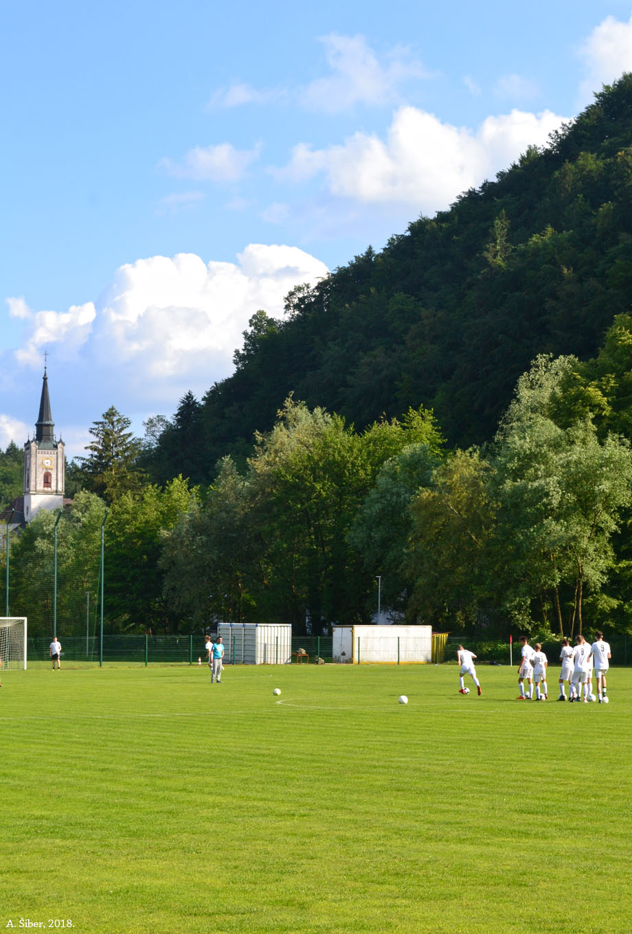Djeca u bijelim dresovima na mirnskom igralištu igraju nogomet (ispod). U pozadini se vidi toranj crkve Ivana Krstitelja (Janeza Krstnika).