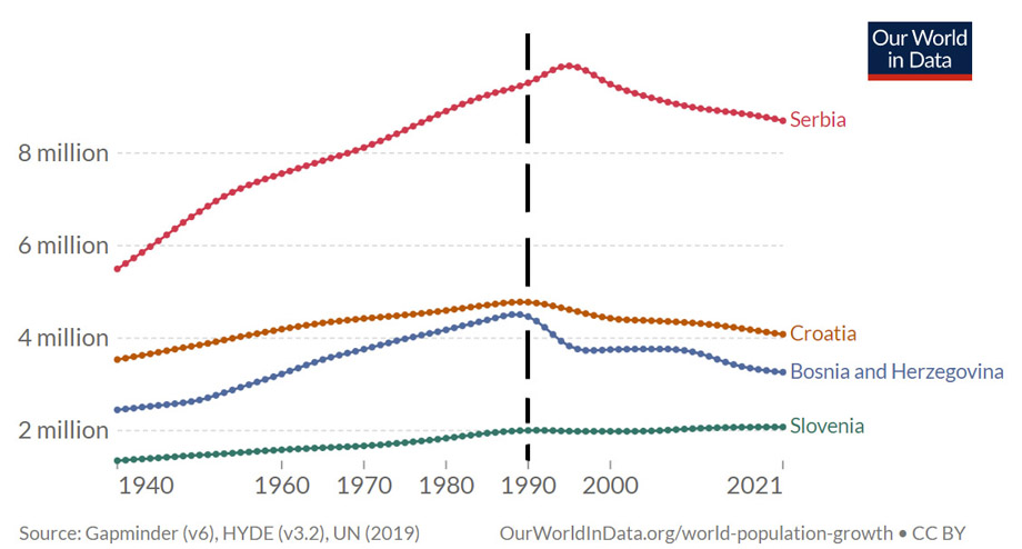 Kad se pogleda povijest populacijskog rasta, i u Hrvatskoj, a pogotovo u BiH vidi se nagli slom rasta 1990. godine, a isto se dogodilo i u Srbiji nekoliko godina kasnije (slika ispod). Slovenija je kroz te godine prošla relativno glatko i ne opaža se nagli slom rasta. Ove su nas godine u Hrvatskoj i opet popisivali pa bismo iduće godine trebali znati koliko nas je točno i jesmo li još uvijek na čelu Europe po postotku katolika: