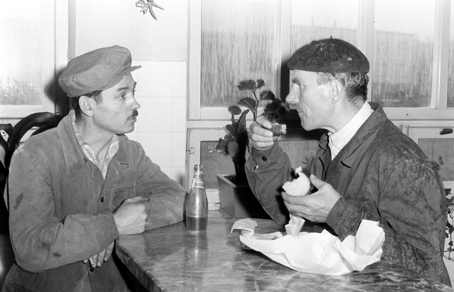 Dvojica radnika fotografirana u restoranu tvornice (okrepčevalnici; ispod), također 1961. godine, vjerojatno ne razgovaraju o posjetu Modiba Keite. Vani lijeva kiša, a njih dvojica su se sklonili. Jedan jede kobasicu i komad kruha, a drugi puši i pije (sok?). Možda je ovaj s kobasicom bio u obližnjem Ptuju pa prepričava vijesti iz vanjskog svijeta.