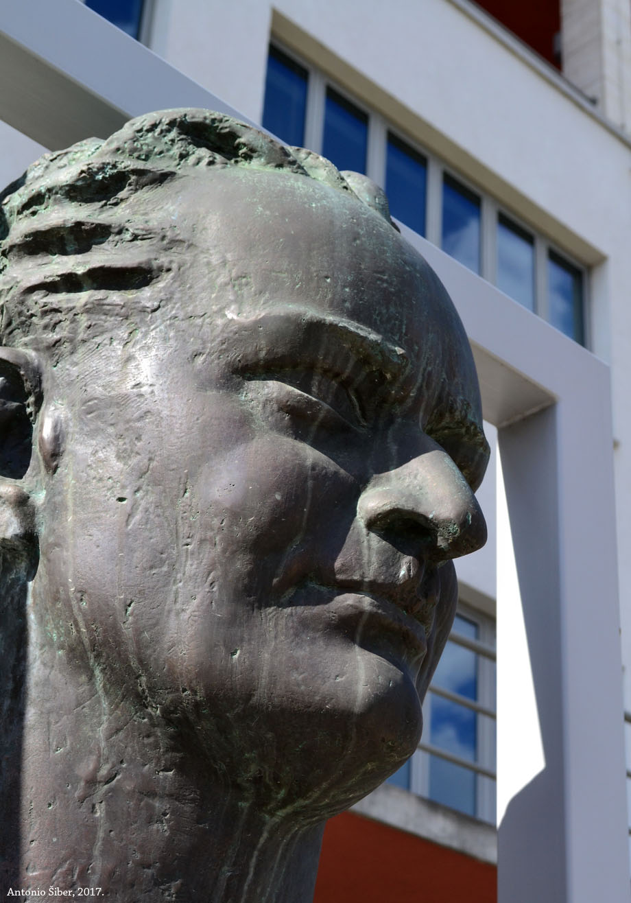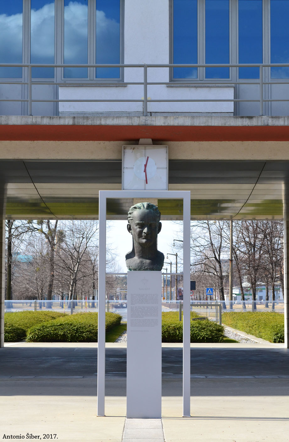Kidričevo izranja iz šume. Osvijetljena industrijska upravna zgrada s bistom (iznad). Ispod biste piše (moj prijevod sa slovenskog):
